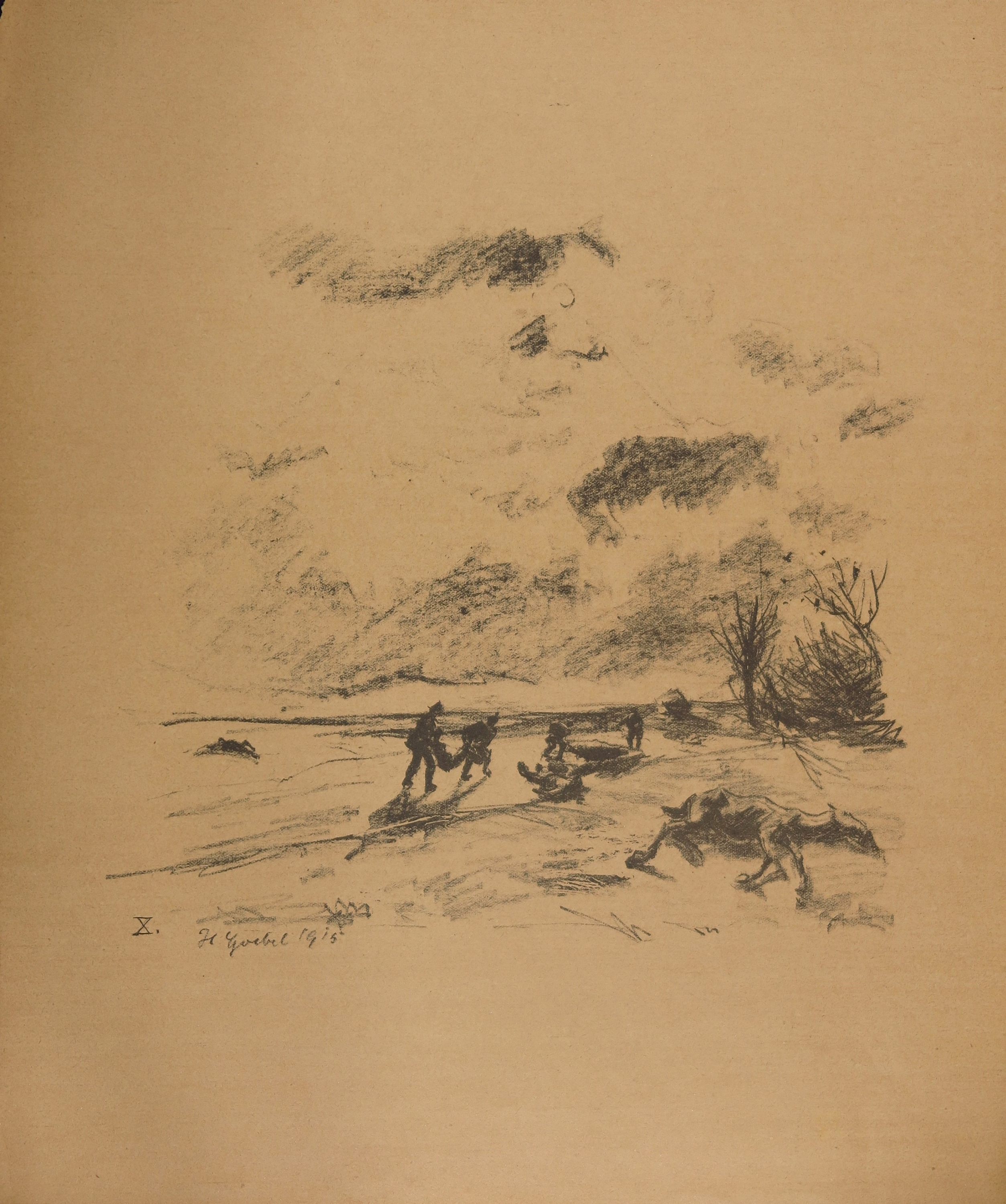 Künstler Prof Hermann Goebel (1885-1945): Soldaten tragen Verwundete, totes Pferd, 1915 |