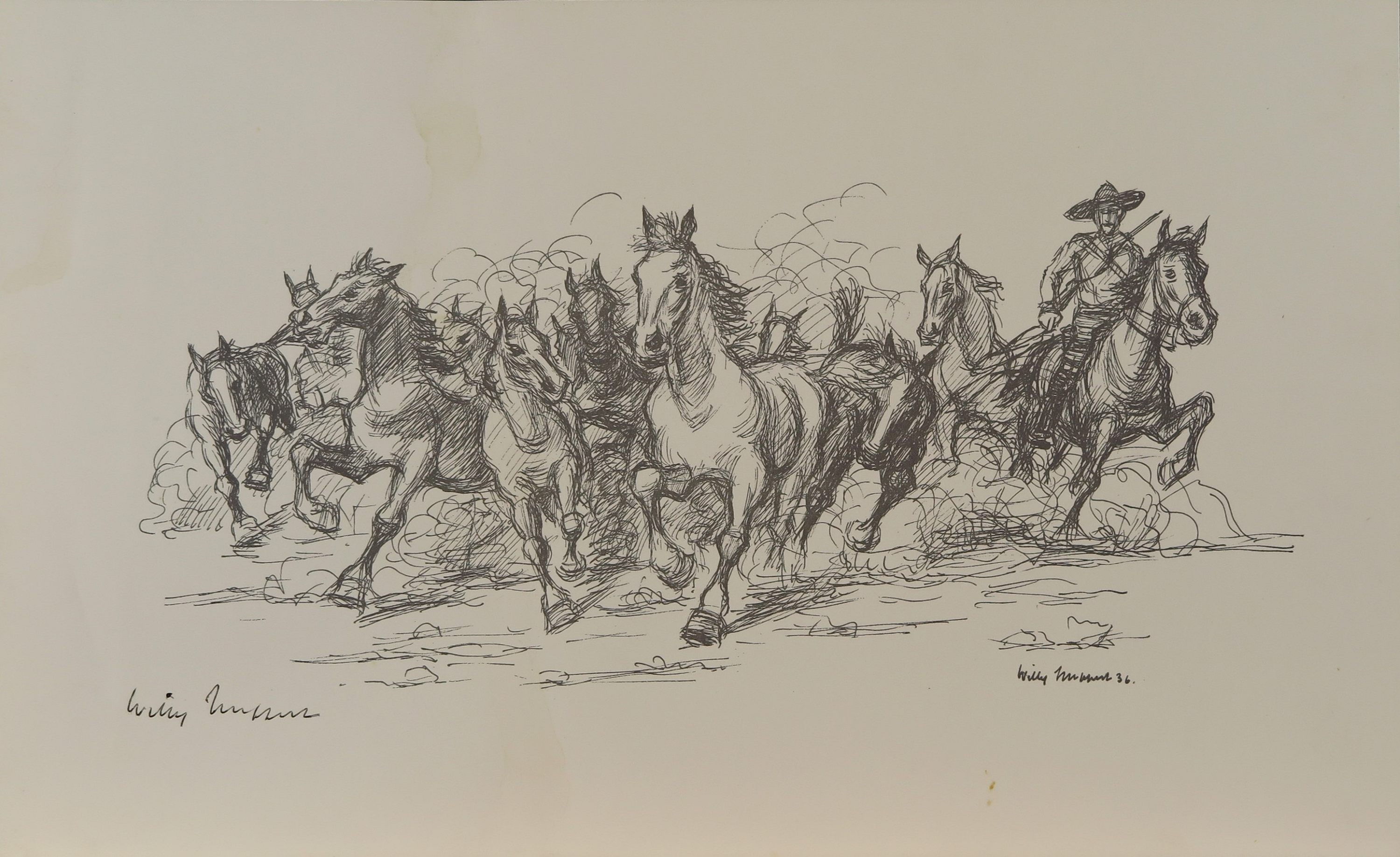 Künstler Willy Huppert (1899-1979): Gallopierende Pferde mit Bewacher |